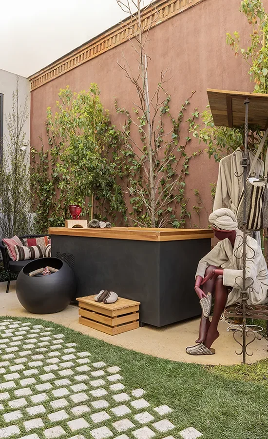 En este ambiente exterior único, la diseñadora Raquel Chamorro ha conseguido un diálogo perfecto entre naturaleza, funcionalidad y clasicismo. Las piezas de Antigüedades Marsol aportan solidez, carácter y profundidad estética:
